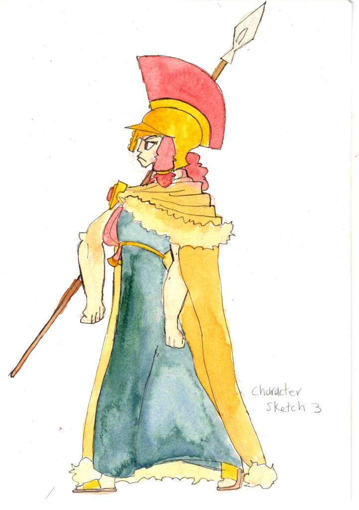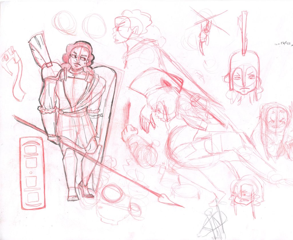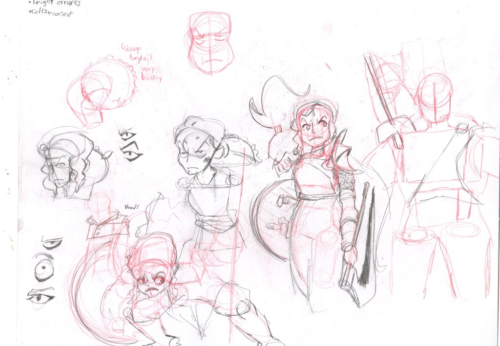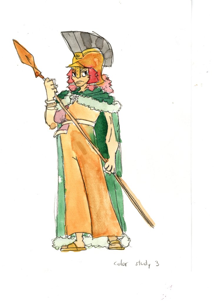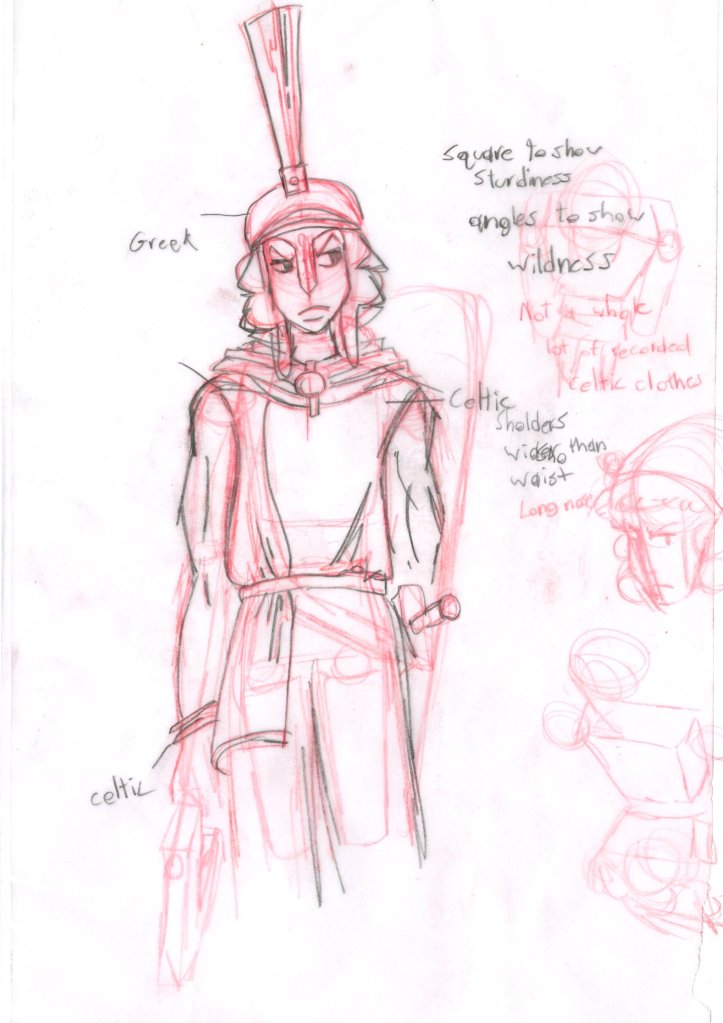 After putting together a solid idea of what the character would be, some further exploratory sketches and color tests were done. Greens, reds, and yellows were incorporated into the character’s color schemes to reflect both the Celtic and Greek origins of the character.
