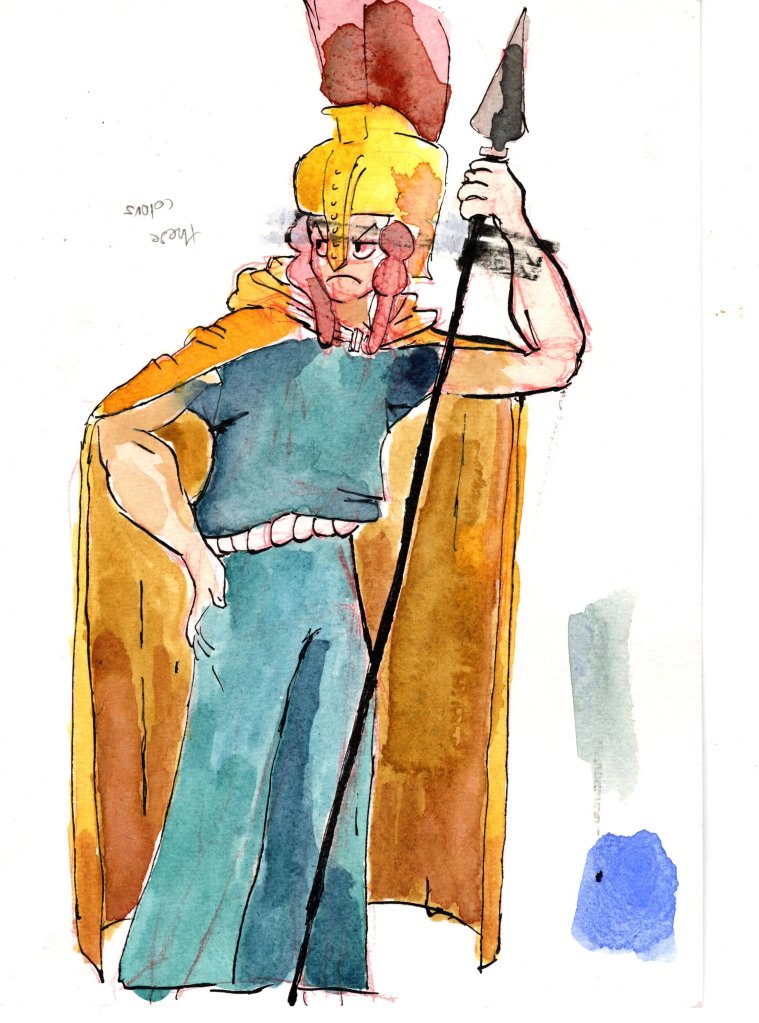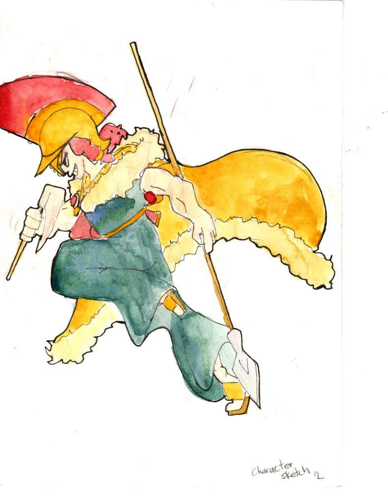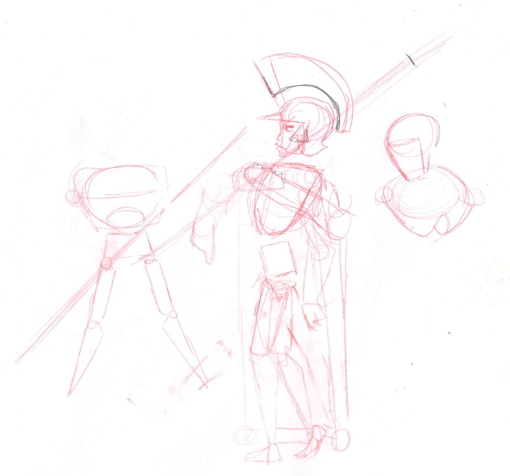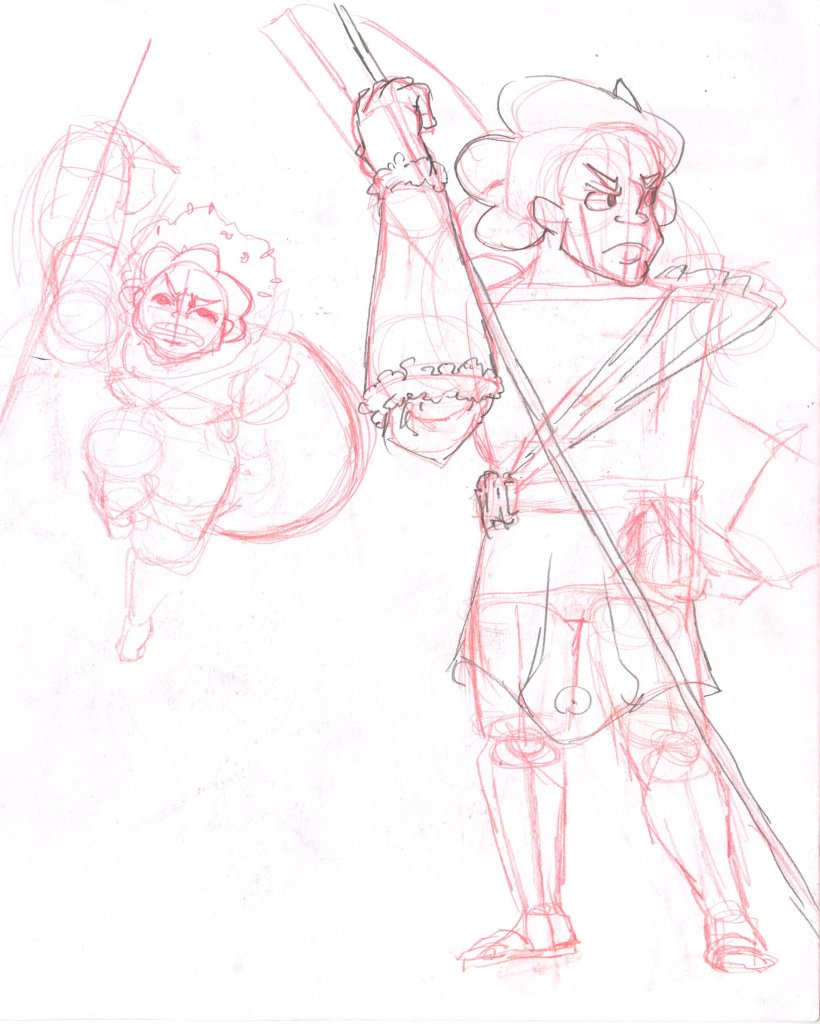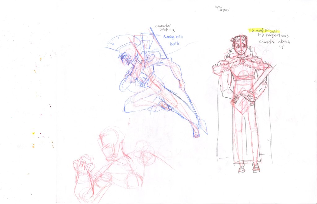 After putting together a solid idea of what the character would be, some further exploratory sketches and color tests were done. Greens, reds, and yellows were incorporated into the character’s color schemes to reflect both the Celtic and Greek origins of the character.
